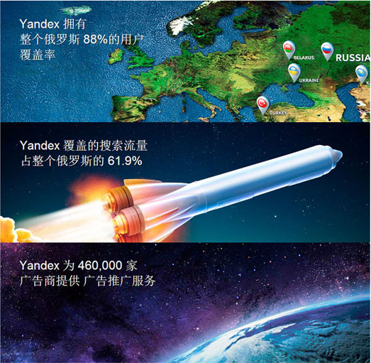 Yandex是全球最大的俄文網站,擁有俄羅斯、白俄羅斯。烏克蘭等十幾個俄語系國家80%以上的網民
