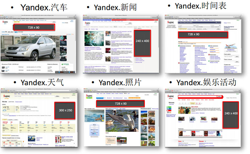 ◆ 主題廣告(Yandex廣告聯盟) Yandex廣告聯盟的廣告主要出現在與Yandex合作的各種網 站的網頁上,且能根據不同網站的主題和用戶的搜索行為對 廣告進行展示。目前,Yandex廣告聯盟的日訪問量已近150 0萬人。